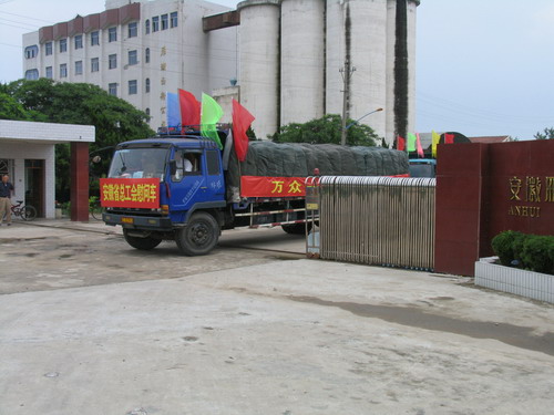 7月25日上午十时,五辆悬挂着“安徽省总工会慰问车”条幅的大型货车满载着救灾面粉缓缓驶出雁湖面粉公司厂区,奔赴本省的临泉县灾区。这是由省总工会组织社会各界向灾区捐赠的首批救灾物资。安徽雁湖面粉公司是省总工会指定的救灾面粉唯一供应商。
