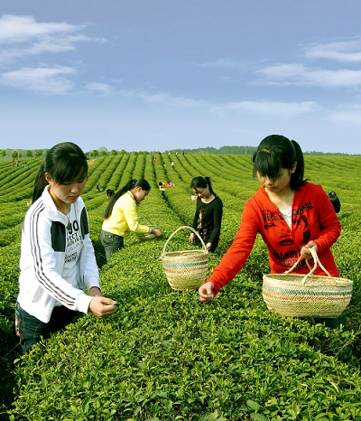 图片说明:在安徽垦区,这个春天格外忙碌。为了积极化解年初冰冻灾害对农业生产的不利影响,安徽农垦细化管理措施,加强技术指导,抢抓农时促增收。图为敬亭山茶场优质生态茶园近日全面开采。