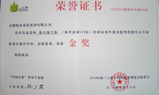 敬亭绿雪荣膺(上海)国际茶业博览会中国名茶 “金奖”
