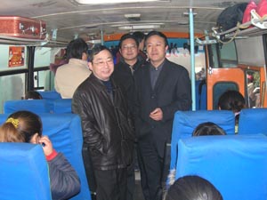 21日一大早,场领导韩大鸣、林贤传、陶卫东及各 分场领导、机关科室负责同志就来到出发现场为外 出姐妹送行。韩大鸣等场领导还走进车内,与大家 道别,叮嘱她们出去后努力工作,发扬我们农垦人 吃苦耐劳、勤劳致富的传统,在他乡展示出农场人 良好的精神风貌。通过辛勤劳动,既增加了收入, 也拓宽了视野,学到了新的劳动技能,为今后的发 展创造了有利条件。大家对场领导的亲切关怀报以 热烈掌声。图为场领导在车上看望外出务工人员的 情景。(杨登宏摄)