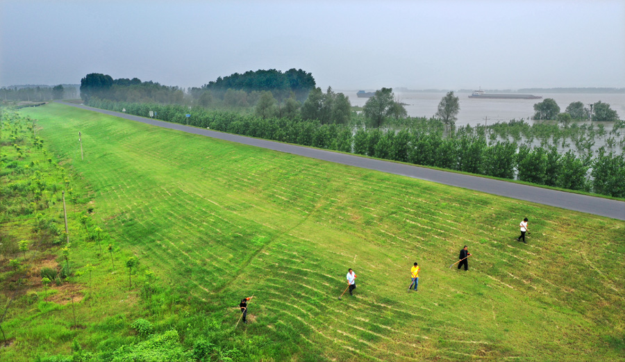 7月16日,位于安徽宣城的敬亭山茶场青草湖分场朱桥联圩的圩堤上,茶场与朱桥乡护堤人员通过交接“水牌令”进行值班交接,场地携手巡堤护圩,同保家园。当地有一个传统,就是每当青草湖水位超过保证水位时,会启用"水牌令",就是一个形状类似于船桨、大小约1米长的木牌。"水牌令"的启用标志着严重汛情的来临,当地居民看到水牌,就像看到防汛集结令一样,要全力以赴投入到防汛中。这种特殊的巡堤方式,在当地已经沿用近千年。